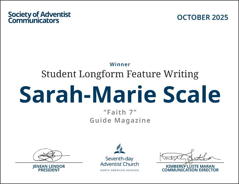 Sarah-Marie Scale, known to Guide readers by her pen name B.J. Jordan, won the Student Longform Feature Writing Award at the Society for Adventist Communicators convention in October. She won for the story “Faith 7” that appeared in the February 22, 2025, issue of Guide. The judges commented, “Excelled in all criteria, including creativity, idea development, and writing quality” and “creative and original, this piece uniquely blends history and faith lessons. Its bold structure and engaging style make it a memorable and compelling feature.” Sarah-Marie’s is 17 years old, making her one of the youngest — if not the youngest — writer to be awarded at the convention.
